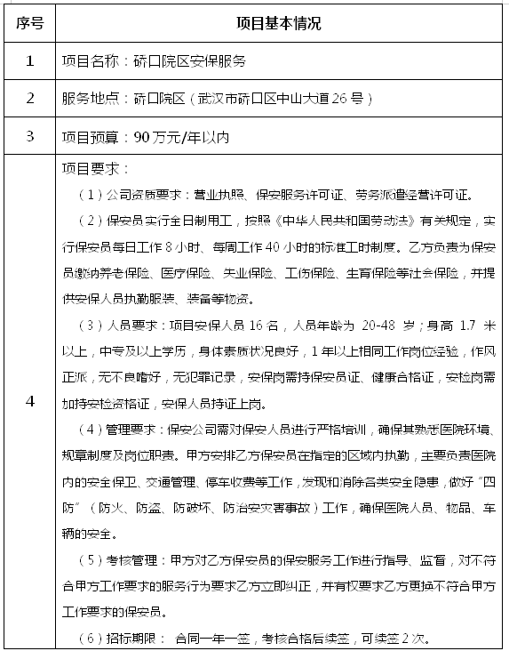 根据我院安保服务项目需求,拟立项招标安保服务项目,现将相关要求公布如下,欢迎有意向、符合条件的企业积极报名。
